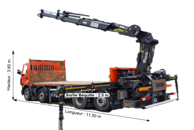 L'avantage du camion plateau grue arrière est de pouvoir faciliter les déchargements à la grue . En effet la position arrière de la grue permet de déposer plus facilement les Big-Bag des deux côtés du camion mais aussi par l'arrière du camion. Notre camion plateau grue arrière peut transporter jusqu’à 16.5 tonnes de charge maximum. Il peut déposer des Big-Bag ou Palettes à environ 6 mètres de chaque côté du camion et derrière le camion. La grue peut passer au-dessus d’une clôture ou d’une de haie de hauteur maximum de 1.50 m. Attention à la présence de fils électriques qui peuvent empêcher le passage. Bien prévoir que le camion à des béquilles a déplier de chaque côtés.